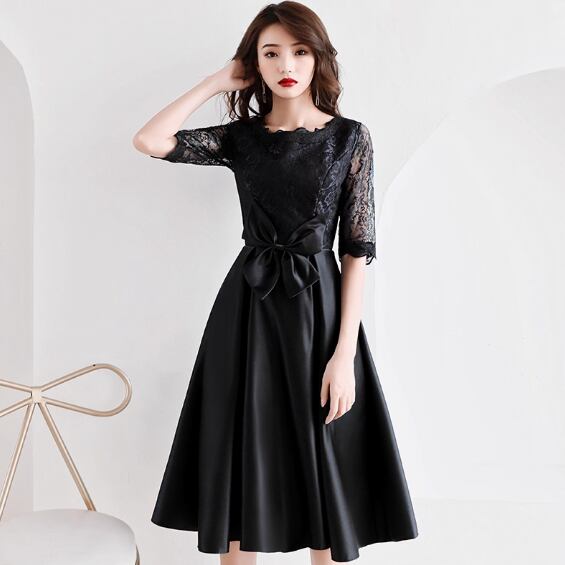 ひざ丈ドレス ドレス パーティー 二次会 披露宴 演奏会 発表会 ステージ 謝恩会 ひざ丈 5分袖 ラウンドネック 襟なし Aライン イブニング レース リボン ウエストリボン 透け感 可愛い きれいめ 大人可愛い 上品 おしゃれ キュート エレガント 存在感 クラシック 清楚 華やか クラシカル 無地 イベント ホテル レストラン 美脚 脚長 高見え 格上げ プチプラ 春 夏 秋 ロングシーズン XS 2XL 3XL 小さい 大きい S M L XL カラバリ 光沢感 ネイビー ブラック ブルゴーニュ