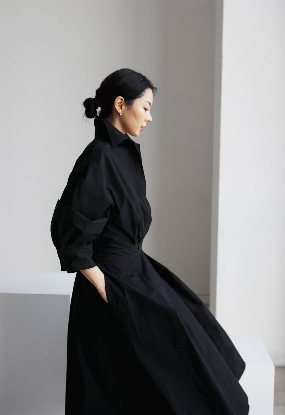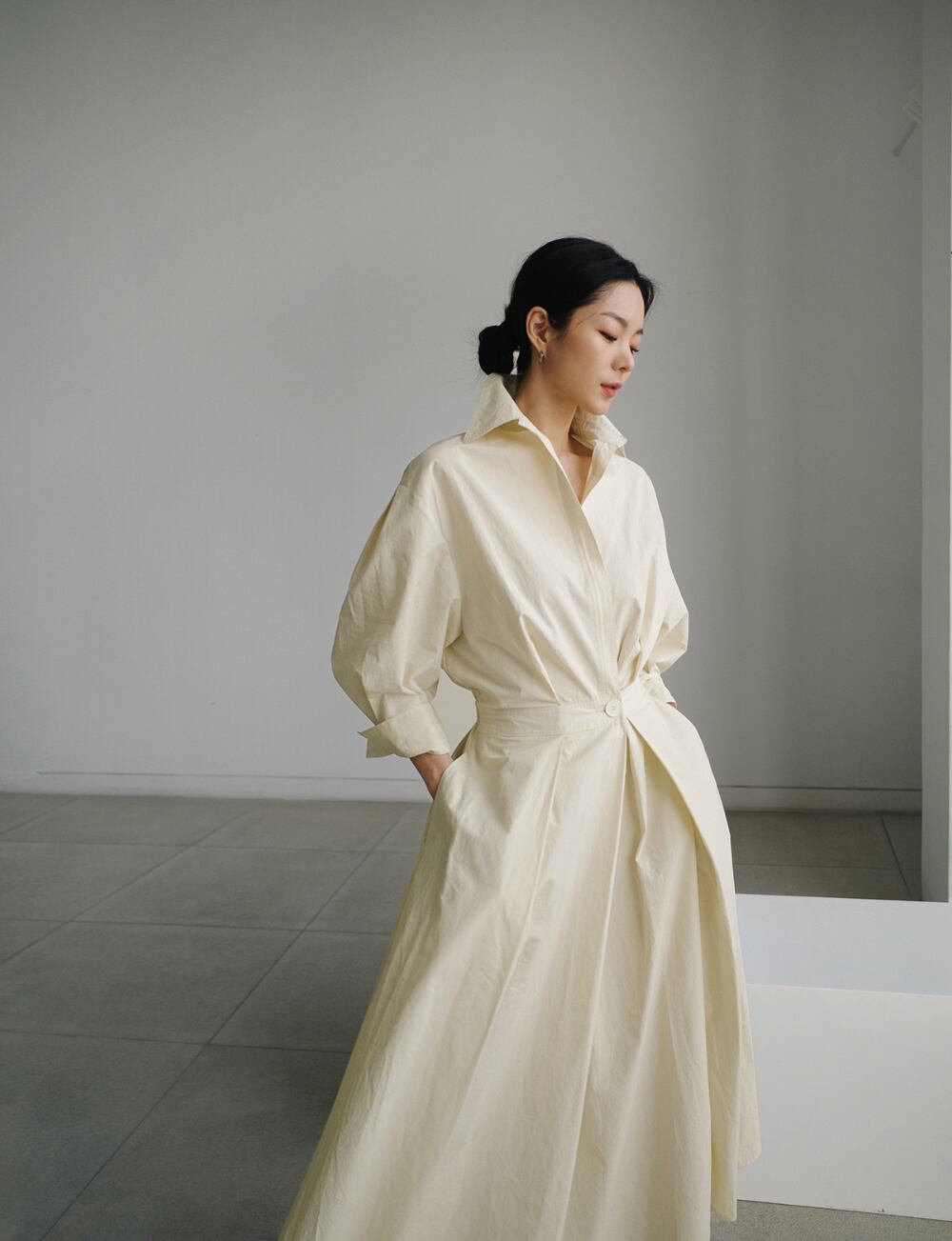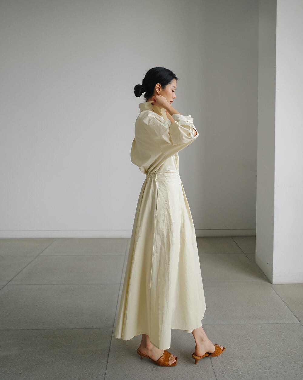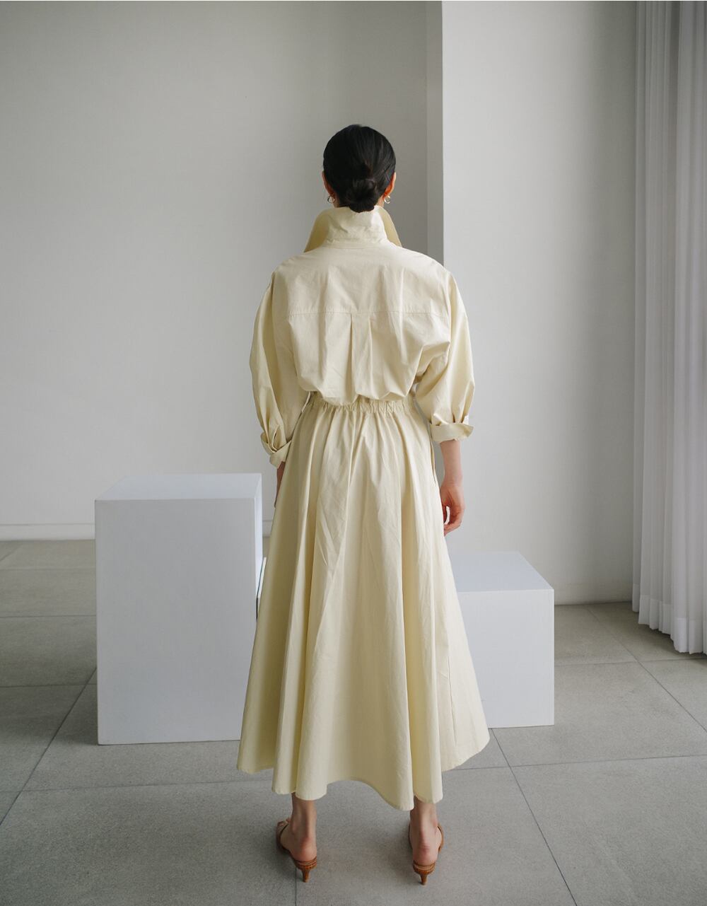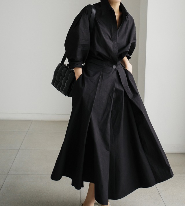 ボックスプリーツのふんわりとしたボリューム感が華やかさを演出し、シックなシャツ仕立てが大人の魅力を引き立てます。膝下の長さで上品さとリラックス感を両立し、カジュアルやきれいめコーディネートにぴったりです。デートやお出かけ、旅行など、さまざまなシーンで主役級の存在感を発揮します。