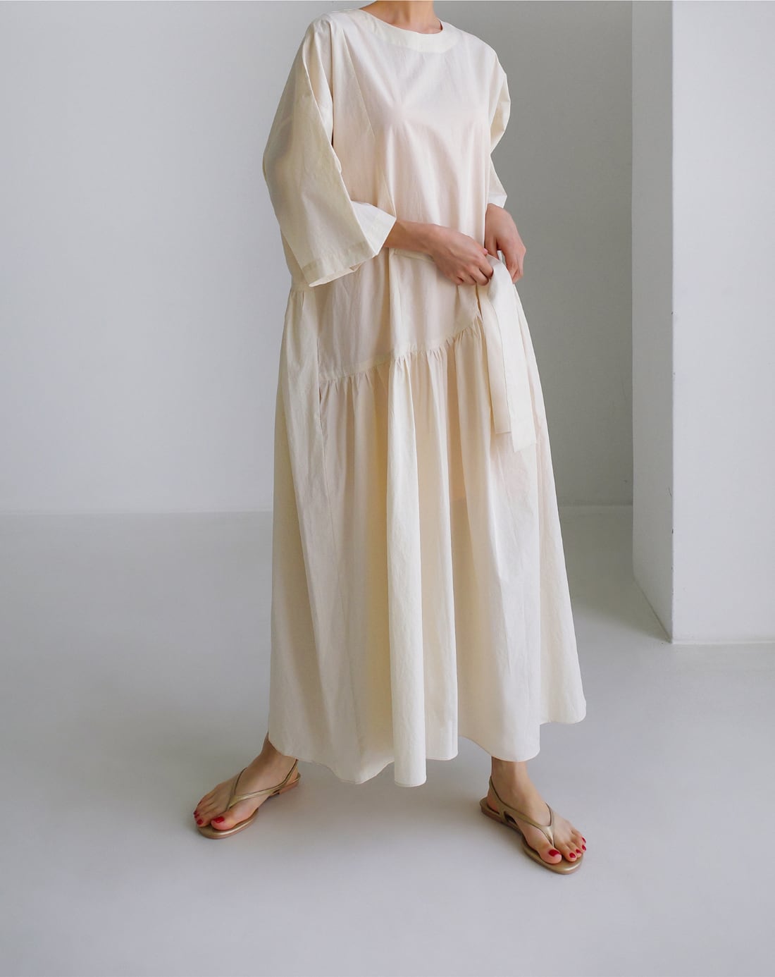 ふんわりとしたギャザースカートが体型を美しくカバーしながら、ミモレ丈で上品さとカジュアルさを絶妙に両立します。
