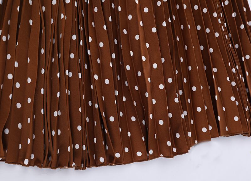 ドット柄と繊細なプリーツが組み合わさった、大人可愛いデザインのロングスカートです。