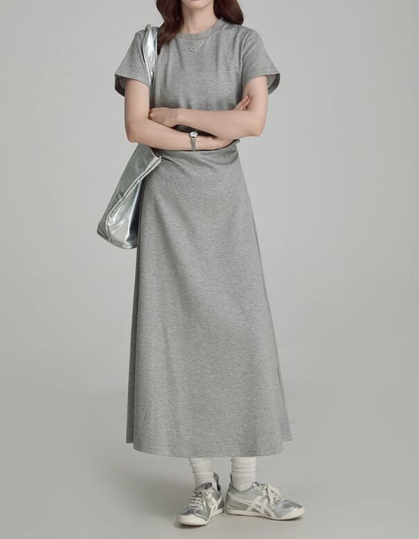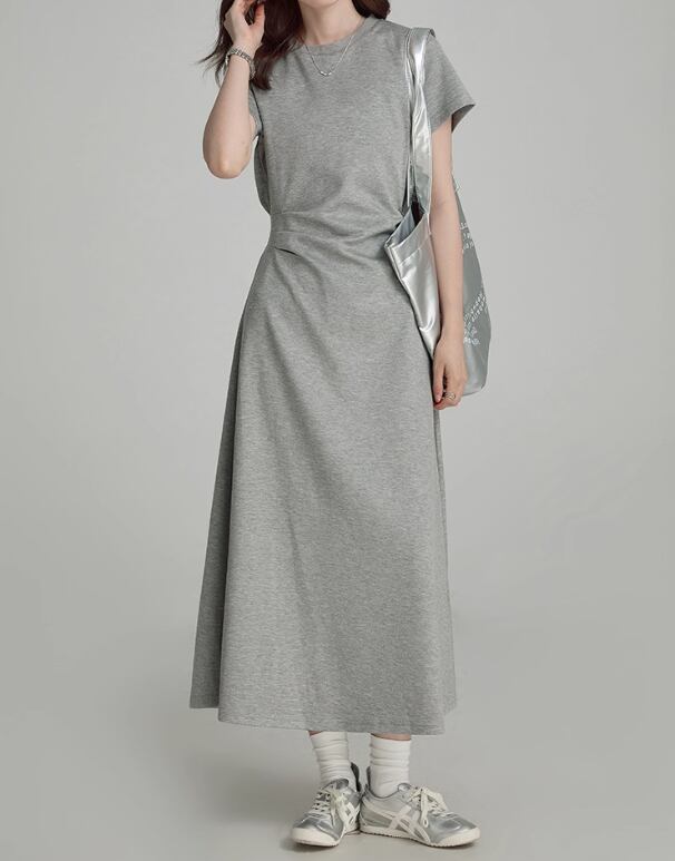 ロングワンピース ロングワンピ レディース ワンピース ロング 半袖 ラウンドネック 襟なし ウエストマーク かわいい シンプル カジュアル おしゃれ ラフ ガーリー ルーズ 存在感 キュート ベーシック カントリー アクティブ ナチュラル 無地 春 夏 秋 ロングシーズン ママ お出かけ 旅行 公園 女子会 休日 ショッピング お花見 カフェ 韓国 オルチャン 楽ちん プチプラ 普段使い 着回し インスタ映え 定番 S M L 小さいサイズ 大きいサイズ グレー ベーシックカラー 大人カラー