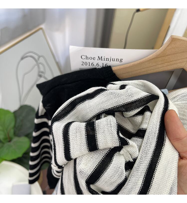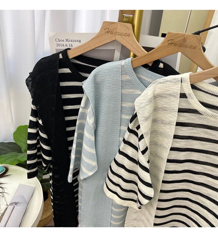 五分袖とラウンドネックのデザインが特徴的で、肩にかけたようなこなれ感を演出します。カジュアルなボーダー柄で、普段使いからお出かけまで幅広く活躍する一着です。