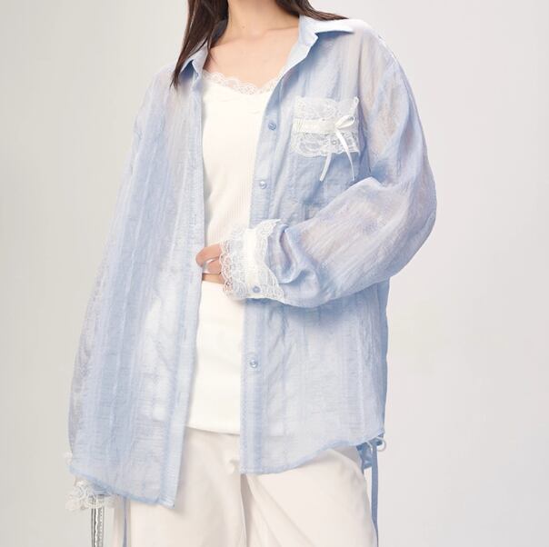 シアーシャツ レディース トップス シャツ 長袖 襟付き レース リボン 前開き かわいい おしゃれ ガーリー 存在感 抜け感 ラブリー キュート ロリータ プリンセス ロマンティック 無地 春 夏 秋 ロングシーズン デート お出かけ リゾート 旅行 海 ビーチ 公園 女子会 休日 バカンス ショッピング コンサート ライブ お花見 カフェ フェス 韓国 オルチャン プレゼント プチプラ 普段使い 着回し モテ インスタ映え XS S M L 小さいサイズ 大きいサイズ ブルー 春カラー