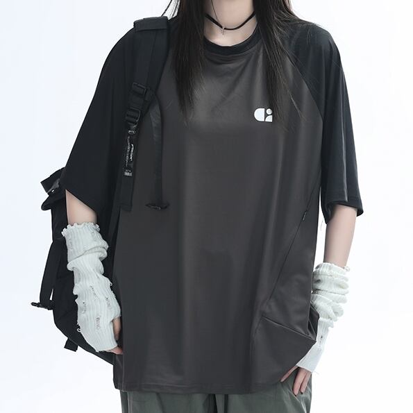 半袖クルーネックのオーバーサイズラグラントップスが登場です!幾何学パターンのワンポイントロゴがシックな印象を与え、ラグランデザインがマニッシュでおしゃれな一着に仕上げています。カジュアルでありながら、こなれ感を演出するこのアイテムは、大人可愛いスタイルを実現します。体型カバー効果もあり、リラックスした着こなしが楽しめる魅力的なトップスです!