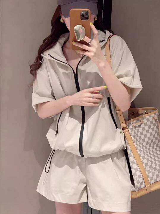 トップスは半袖のパーカーで、前開きのファスナー付き。