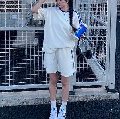トップスはクルーネックのカジュアルTシャツで、半袖デザインが夏の爽やかさを演出します。