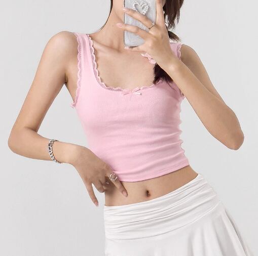 レディース トップス シャツ クロップド丈 袖なし ノースリーブ タンクトップ スクエアネック タイト レース リボン かわいい おしゃれ ガーリー 存在感 ラブリー キュート プリンセス ロマンティック 無地 春 夏 秋 ロングシーズン デート お出かけ 女子会 休日 ショッピング コンサート ライブ お花見 カフェ ピクニック ランチ 重ね着 韓国 オルチャン プチプラ 普段使い 着回し モテ 清楚 トレンド 流行 インスタ映え S M L カラバリ ホワイト ブラック ピンク ベーシックカラー