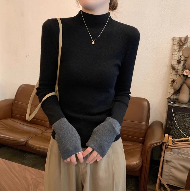 レディース トップス ニット セーター 長袖 萌袖 ハイネック タイト スリム 細身 バイカラー 配色 かわいい 大人可愛い シンプル 上品 おしゃれ レトロ こなれ感 ガーリー 存在感 ラブリー キュート ベーシック ナチュラル 無地 春 秋 デート お出かけ 旅行 女子会 休日 ショッピング コンサート ライブ お花見 カフェ ランチ ピクニック 楽ちん プレゼント プチプラ 普段使い 着回し モテ インスタ映え S M L カラバリ 黒 ブラック カーキ ベーシックカラー 大人カラー 秋カラー
