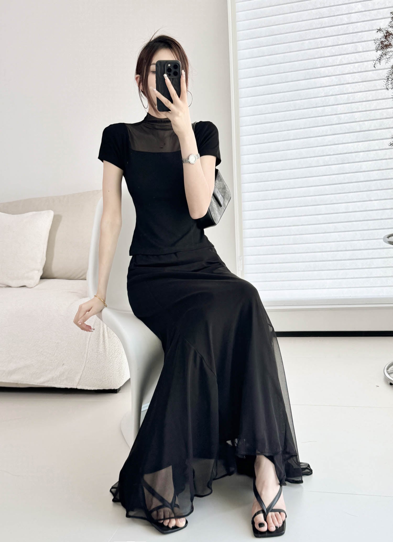 洗練されたマーメイドシルエットが魅力的なスカートです。軽やかなチュール素材の透け感が上品さを引き立て、裾のフレア感が華やかさと大人可愛い印象を与えます。シックなブラックカラーは、カジュアルなシーンから特別なイベントまで幅広くご着用いただけるアイテムです。ロングシーズンに着回せて、デート、お出かけ、パーティーなど、さまざまなシーンで大活躍します。