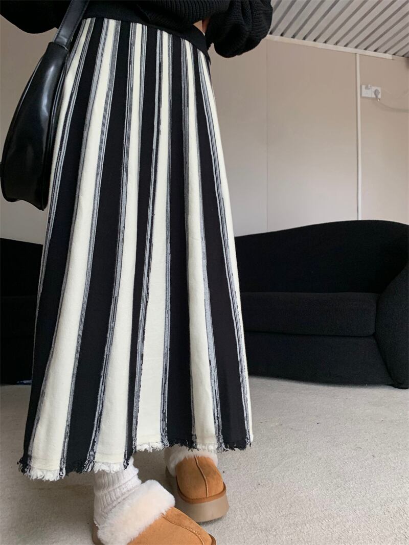 裾のフリンジが可愛い太ストライプ柄のAラインスカートです!大人可愛い印象を与えつつ、シンプルでありながらもおしゃれなデザインが魅力です。カジュアルな日常使いから、エレガントなお出かけ、さらにはデートや女子会まで、幅広いシーンでその存在感を発揮します。レトロでモード系の雰囲気を持ちながらも、クールに決まるこのスカートは、あなたのスタイルに個性的なこなれ感をプラスしてくれます。