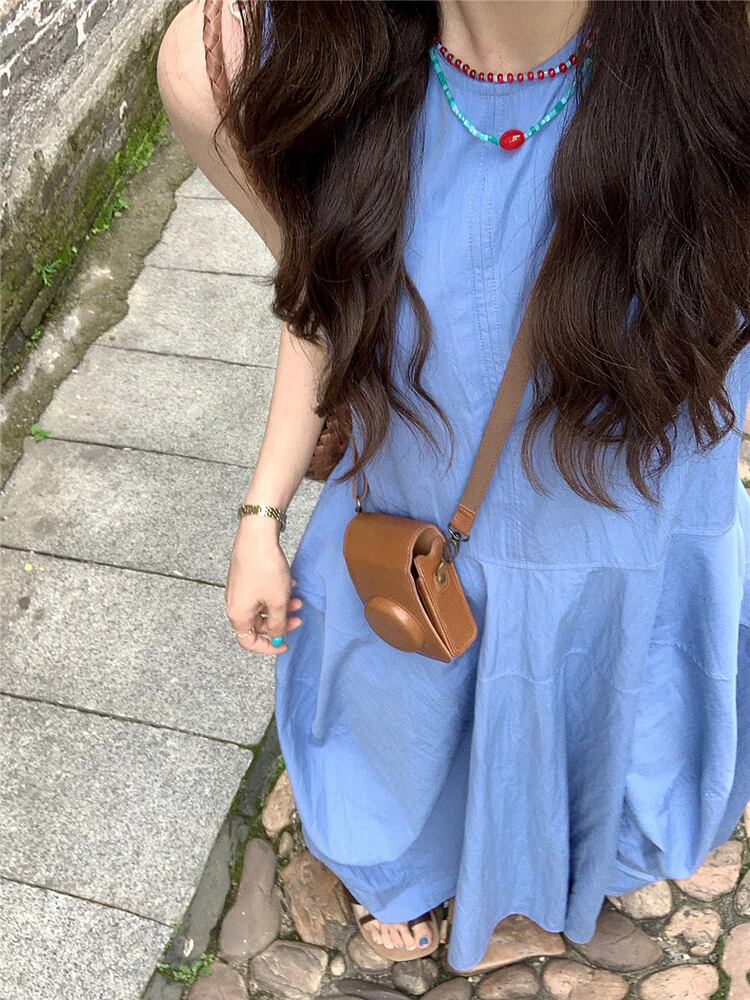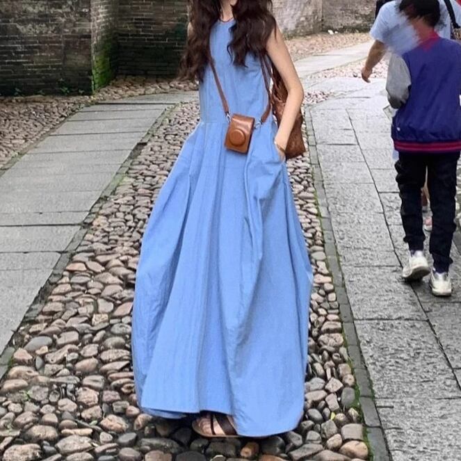 ワンピース 膝下 ロング ノースリーブ クルーネック フレア かわいい 大人可愛い きれいめ シンプル カジュアル 上品 おしゃれ かっこいい こなれ感 ラフ ガーリー ルーズ 個性的 クール モード系 エレガント 主役級 存在感 キュート 都会的 ラグジュアリー ナチュラル 夏 学生 学校 お出かけ お泊まり パーティー イベント リゾート 旅行 海 プール ビーチ 公園 女子会 休日 ホテル ガーデン ショッピング ライブ カフェ 韓国 オルチャン 体型カバー 流行 S M L XL 2XL