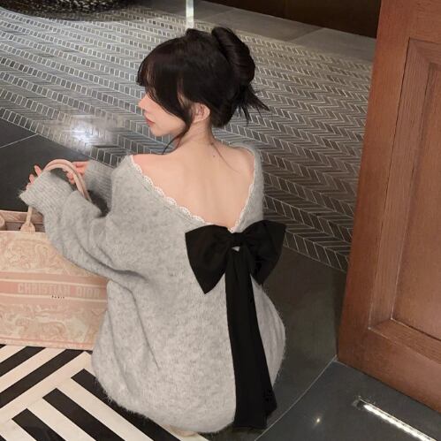 ニットワンピース レディース ワンピース ニット ショート 長袖 ドロップショルダー 萌袖 Vネック オーバーサイズ リボン バックリボン かわいい おしゃれ ガーリー ルーズ 存在感 ラブリー キュート ロマンティック 無地 春 秋 冬 ロングシーズン デート お出かけ 女子会 休日 ショッピング コンサート ライブ お花見 カフェ 韓国 オルチャン コーデ 楽ちん プチプラ 普段使い 着回し モテ インスタ映え S M L XL 小さいサイズ 大きいサイズ カラバリ ベーシックカラー 大人カラー