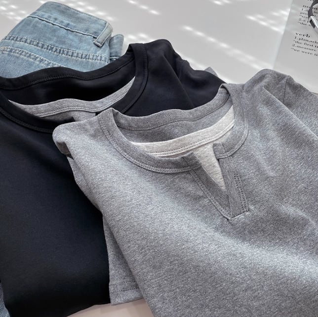 半袖のスリットネックデザインは、シンプルでありながらおしゃれさを引き立てます。