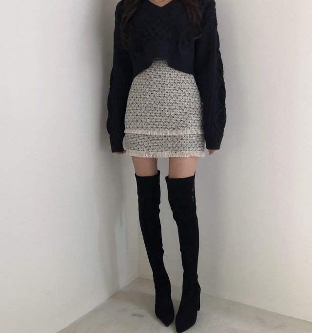ざっくりしたアランニットのトップスと、フリンジミニスカートのセットアップ。
