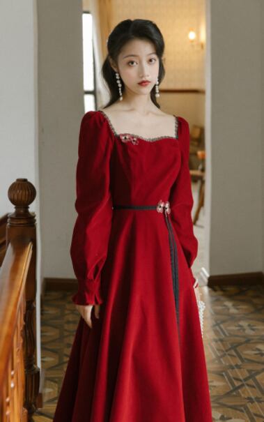 ワンピドレス レディース ワンピース ミモレ丈 スクエアネック フレア 大人可愛い かわいい 上品 大人 おしゃれ レトロ こなれ感 存在感 主役級 S M L レッド 赤 無地 春 秋 二次会 10代 20代 30代 40代 女性用 デート パーティー モテ プレゼント ギフト プチプラ 送料無料 インスタ映え