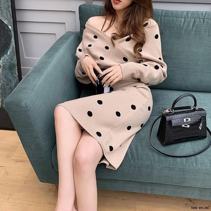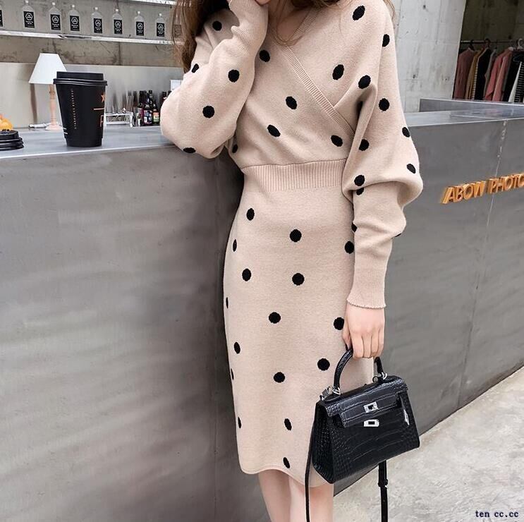 ワンピース ニットワンピース レディース 送料無料 長袖 Vネック ラグランスリーブ オフショルダー ウエストマーク ドット柄 水玉 10代 20代 30代 40代 きれいめ かわいい 大人可愛い 大人かわいい 大人 お洒落 おしゃれ 大人女子 シンプル S M L XL ベージュ お出かけ 休日 普段使い ファッション