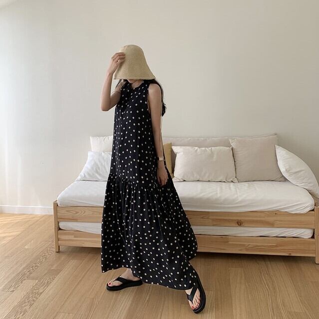 ワンピース レディース 送料無料 フレアワンピース ロング丈 マキシ丈 袖なし ノースリーブ 襟なし フレア セミフレア ストレート プリーツ ウエストマーク ハイウエスト ウエストゴム かわいい 大人可愛い きれいめ シンプル 上品 おしゃれ レトロ 大人女子 こなれ感 キュート エレガント モダン 存在感 抜け感 大きいサイズ フリーサイズ ビッグサイズ ゆったり ゆる 白 ホワイト 黒 ブラック モノトーン ドット柄 水玉 春 夏 10代 20代 リゾート 海 プール 普段使い 楽ちん 体系カバー