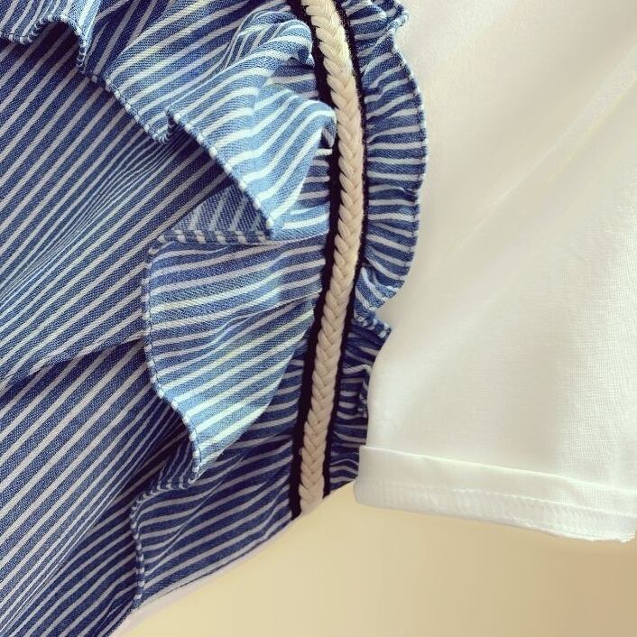 トップス レディース 送料無料 Tシャツ 襟なし バンドスリーブ ラウンドネック 丸首 ストライプ フリル ボックスシルエット ストレート 半袖 切り替えデザイン レイヤー ドッキング パッチワーク コットン 綿 厚手 大人 かわいい 大人可愛い カジュアル ラフ キュート ガーリー ラブリー おしゃれ S M L XL ゆったり ホワイト 白 ブルー 青 ブラック 黒 水色 春 夏 夏カラー 10代 20代 30代 普段使い お出かけ 休日 海 ファッション コーデ 楽ちん 韓国 アシンメトリー