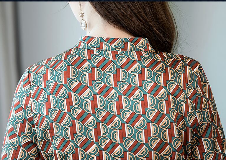 ワンピース レディース 送料無料 レトロ ジオメトリック スタンドネック フレア ミディワンピース袖あり 七分袖 膝下 フレア ウエストマーク かわいい 大人 可愛い 綺麗め 上品 お洒落 大人女子 こなれ感 柄 春 秋 オフィス ビジネス OL 通勤 デート お出かけ 女子会 普段使い 韓国系 オルチャン トレンド