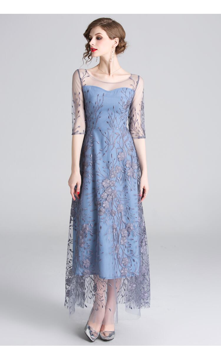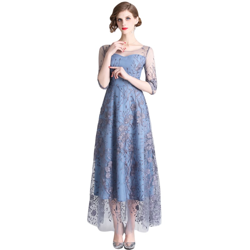 ワンピース レディース 送料無料 フレアワンピース 刺繍ワンピース シースルーワンピース 七分袖 フラワーレース 透け感 パーティードレス エレガント ロング丈 袖付き シースルー 透明感 フェミニン 繊細 エアリーハイウエスト フォーマル パーティー イベント 二次会 きれいめ 大人かわいい おしゃれ ガーリー デコルテ 体形カバー 着痩せ 小顔見せ ブルー パステルカラー レーシー S M L XL 2XL ゴージャス ハートシェイプ 花柄レース インスタ トレンド ロマンチック Aライン
