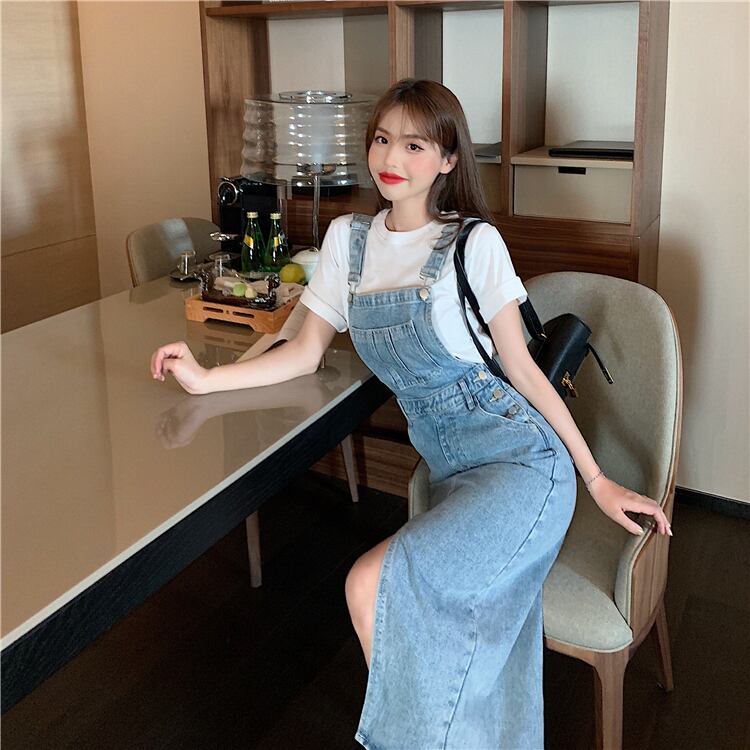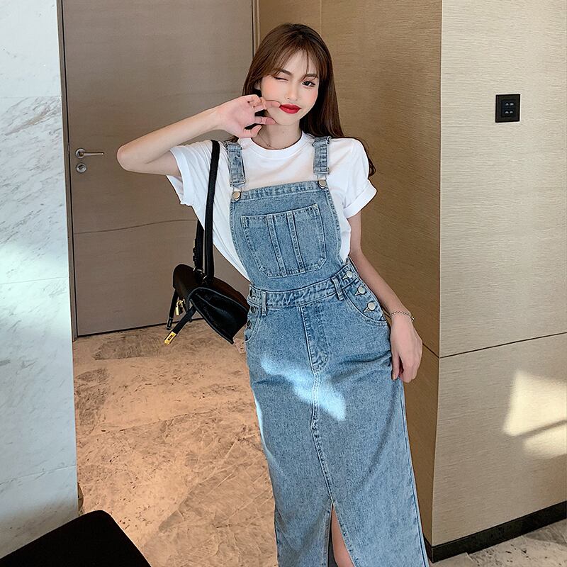 ワンピース レディース 送料無料 2色 デニムワンピース サロペットワンピース スリット ミモレ丈 タイトスカート カジュアル シンプル アクティブ リラックス こなれ感 おしゃれ シンプル ナチュラル スタイル 小顔見せ 着痩せ 体形カバー ジーンズ インスタ トレンド ライトブルー インディゴ かわいい S M L 女子会 カジュアルドレス ラフ キュート ガーリー ママコーデ お出かけ 旅行 デート ベーシック マニッシュ デニム アメカジ ハイウエスト ジャンパースカート