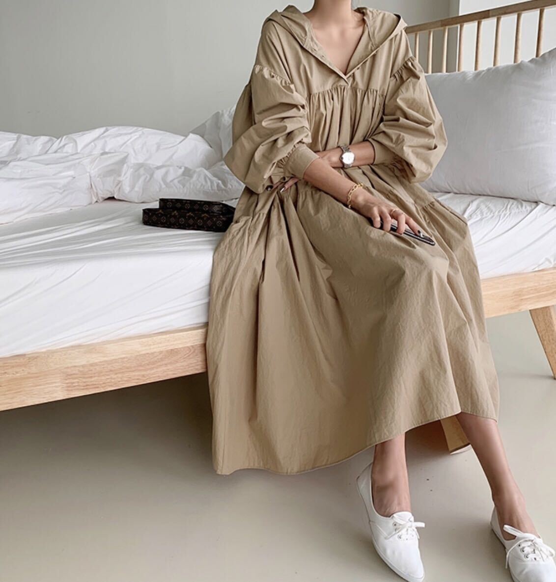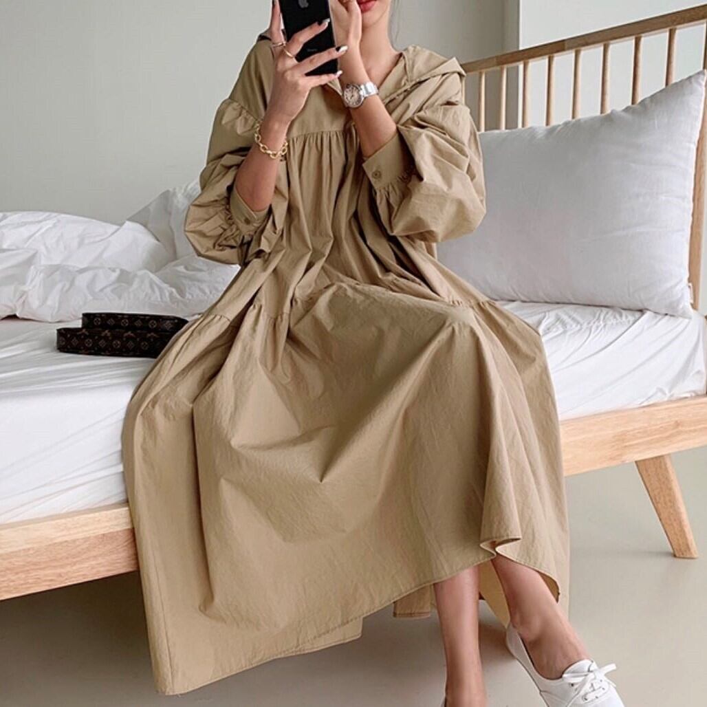フード付きのギャザーワンピース。