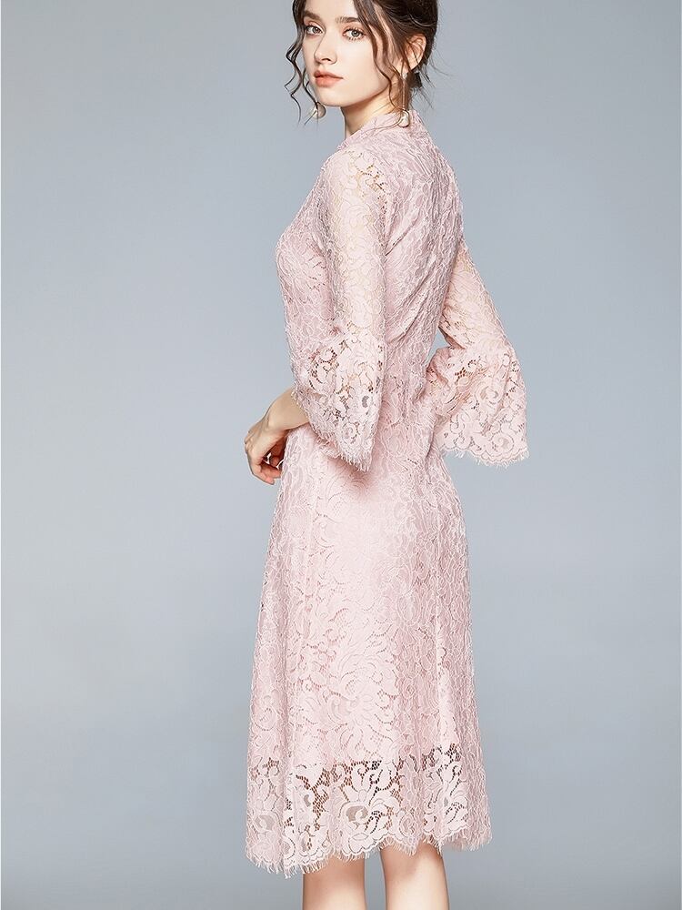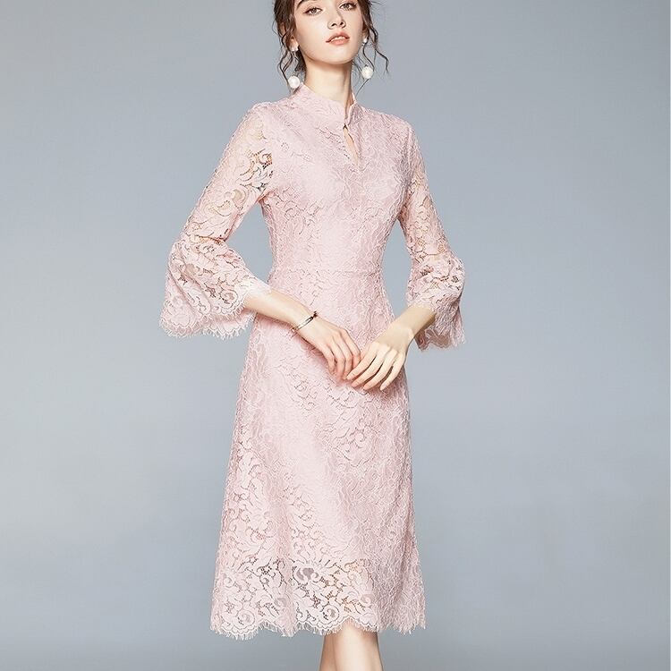 ワンピース レディース 送料無料 2色 長袖 ハイネック Aライン ハイウエスト ベルスリーブ 9分袖 脚長 総レース 花柄 透け感 ミディアム丈 ひざ丈 体系カバー 大きいサイズ フレア フレアワンピース エレガント シンプル 大人可愛い かわいい きれいめ お洒落 おしゃれ 大人女子 ワンピドレス イベント デート パーティ— 女子会 襟なし 白 ホワイト ピンク 水色 ブルー 黒 ブラック M L XL 2XL 3XL 休日 お出かけ 韓国 オルチャン ファッション コーデ