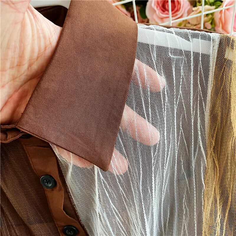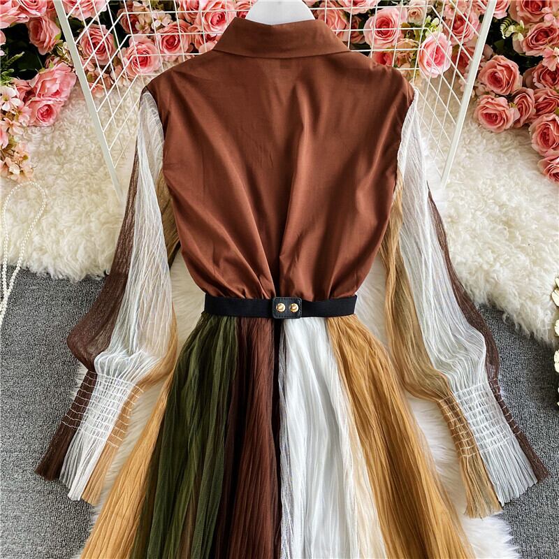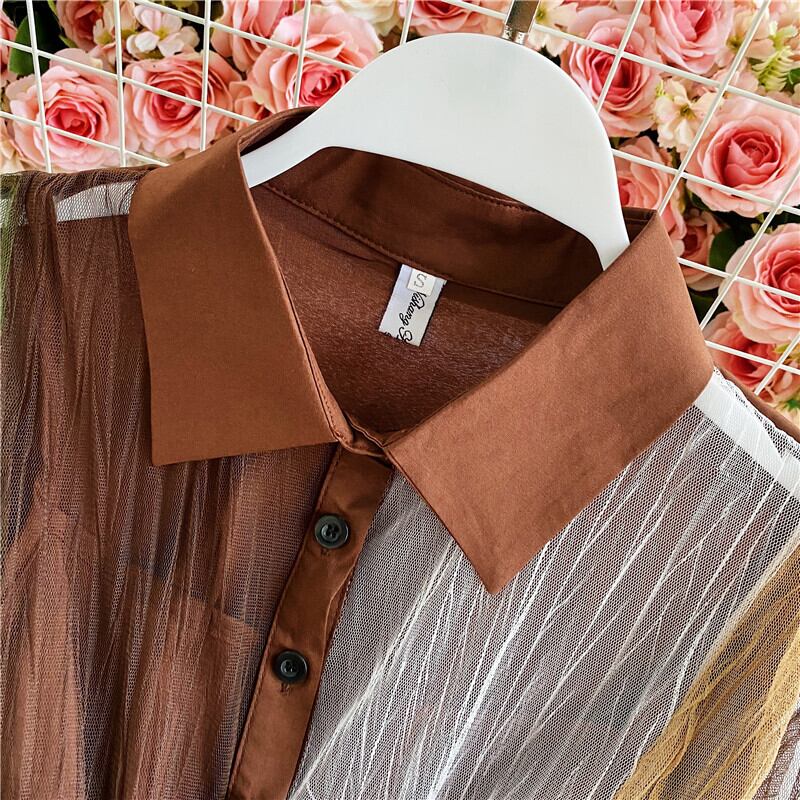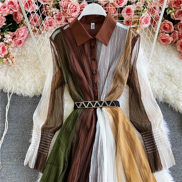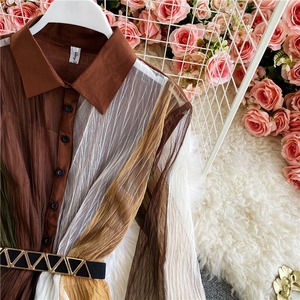 アースカラーの切り替えチュールで仕立てた華やかなシャツワンピースです。