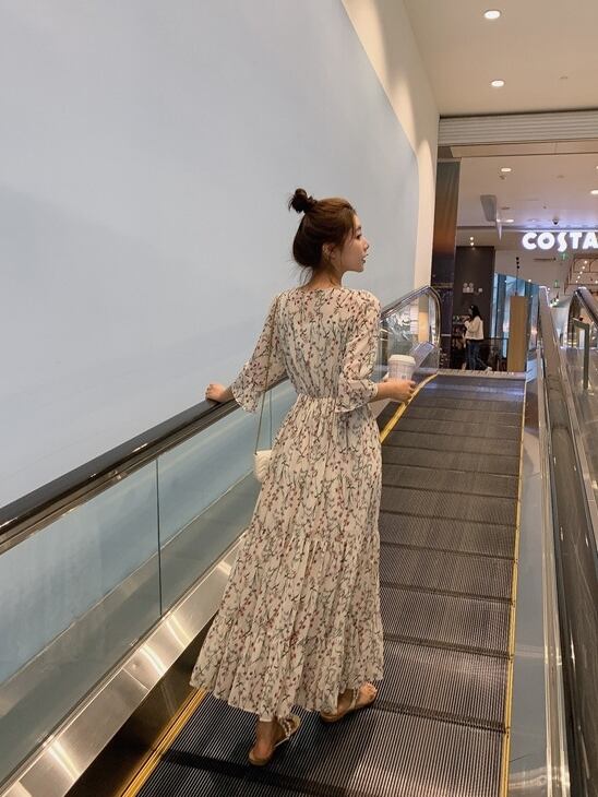 小花柄を散りばめたフレアスカートのロングワンピースです。