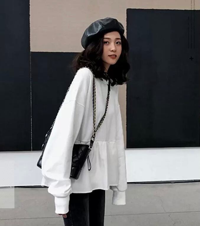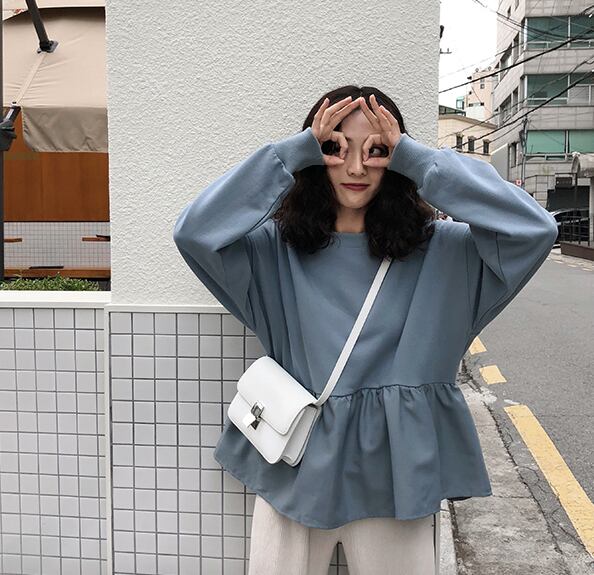 スウェット レディース ペプラム 裾フリル 長袖 トップス カジュアル 楽チン 体型カバー 足長 水色 オレンジ ホワイト ブラック 10代 20代 デート 通学 おしゃかわ アクティブ ゆるかわ 送料無料