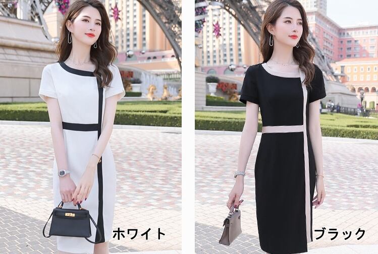 ワンピース レディース 送料無料 タイトワンピース バイカラーワンピース スリット ミドル丈 パイピング ステッチ アシンメトリー フェミニン エレガント モノトーン ブラック ホワイト 白黒 おしゃれ オフィス OL 通勤 スタイル 小顔見せ 着痩せ 体形カバー インスタ トレンド 半袖 フォーマル 入園入学 かっこいい きれいめ 大人かわいい プラスサイズ 大きいサイズ S M L XL 2XL 3XL 4XL クール シャープ ナロースカート モダン フロントスリット ビジネス 美脚 ひざ丈