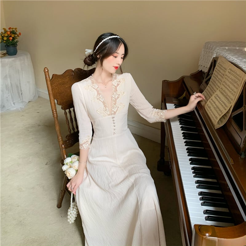 ワンピース ドレス レディース 送料無料 ワンピドレス ロング丈 マキシ丈 9分丈 アンクル丈 5分袖 7分袖 Vネック フレア スリム 細身 レース 刺繍 ウエストマーク ハイウエスト 透け感 かわいい 大人可愛い きれいめ シンプル 上品 おしゃれ レトロ 大人女子 こなれ感 キュート ガーリー ルーズ セクシー エレガント モダン 主役級 とろみ感 S M L XL ゆったり ゆる 白 ホワイト 春 夏 秋 10代 20代 デート お出かけ パーティー イベント リゾート 韓国系 体系カバー 脚長