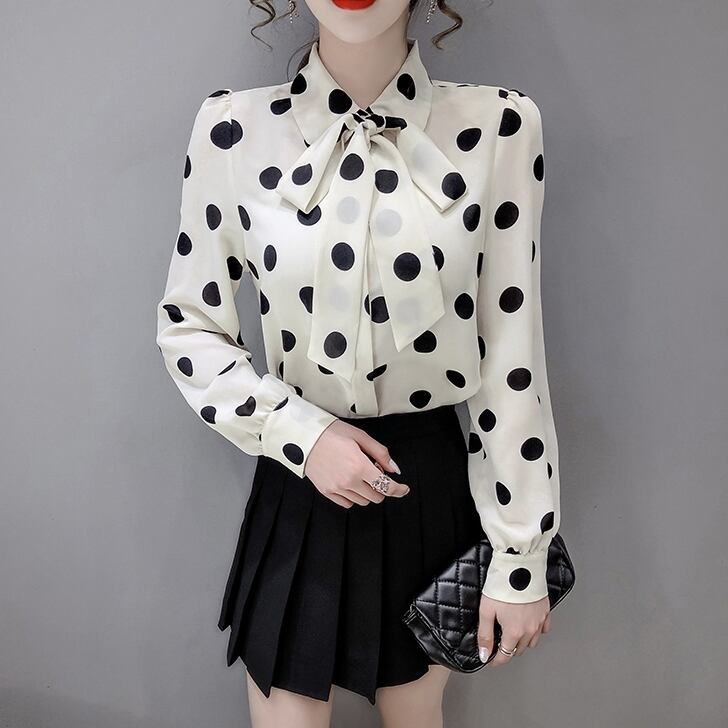 大柄なドットがシンプルでレトロなリボンタイシャツです。