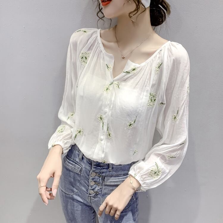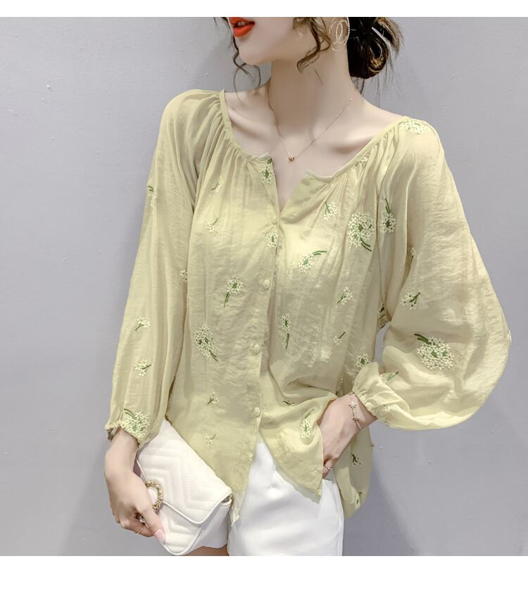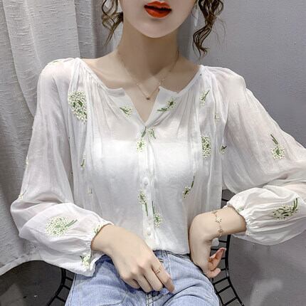 トップス レディース 送料無料 ブラウス シャツ フリル 刺繍 ステッチ レトロ ノーカラー ヴィンテージ パフスリーブ 大きいサイズ サイズ豊富 S M L XL 薄手 プリント かわいい 大人女子 きれいめ 大人 上品 お洒落 おしゃれ クール こなれ感 ルーズ ゆったり ゆる 着回し 普段使い コーデ ファッション 体型カバー 楽ちん デート お出かけ 休日 10代 20代 30代 学生 春 夏 韓国 オルチャン