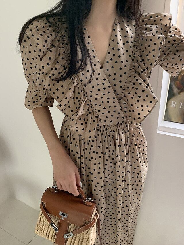 ワンピース レディース 送料無料 2色 フレアワンピース ドット柄ワンピース ミモレ丈 ロング丈 フリル フェミニン パフスリーブ おしゃれ スタイル 小顔見せ 着痩せ 体形カバー インスタ トレンド かわいい 女子会 カジュアルドレス キュート ガーリー デート ロマンチック 大人かわいい ホワイト カーキ エレガント サマードレス ハイウエスト お出かけ 旅行 カジュアルドレス レトロ リゾート ポルカドット 水玉 フレア ボリューム バブルスリーブ キャンディースリーブこなれ感 ナチュラル
