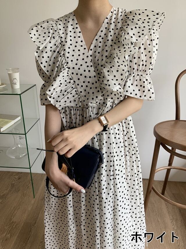 大きなフリルがたっぷりのドット柄フレアワンピース。