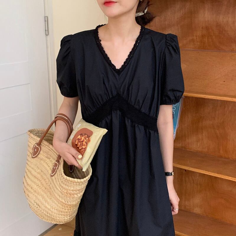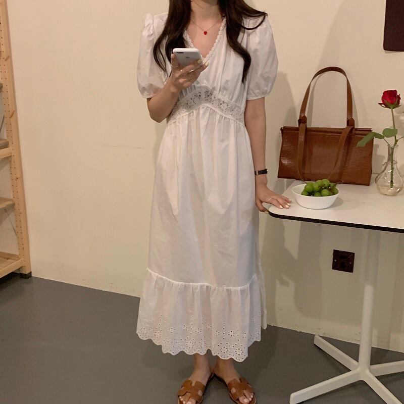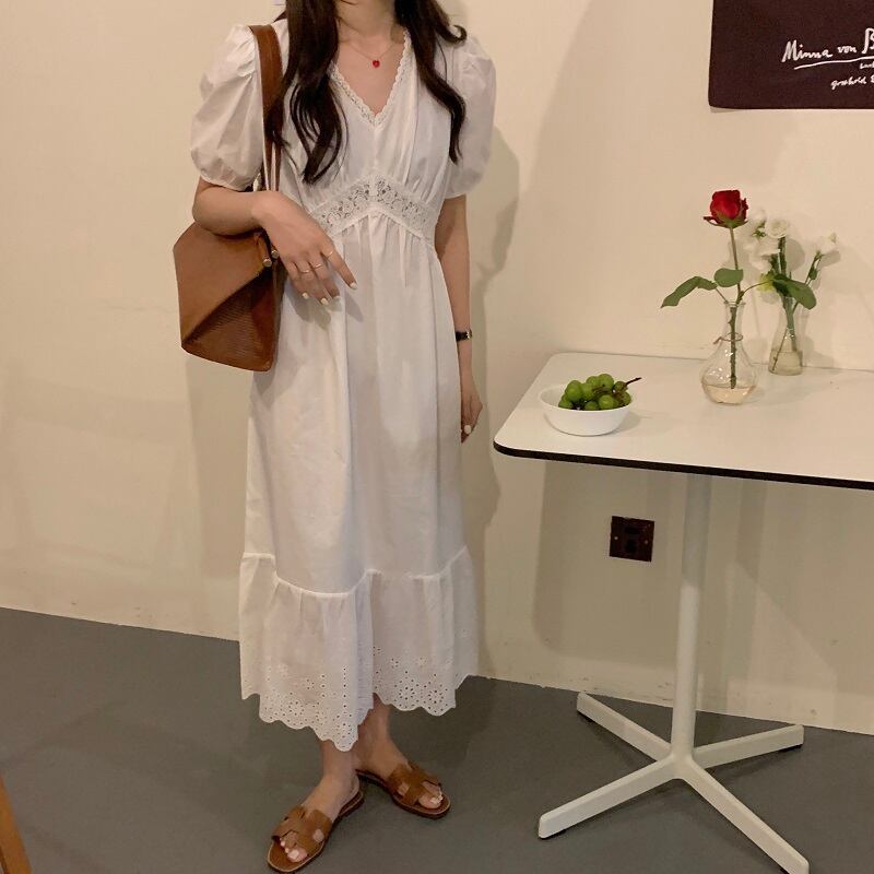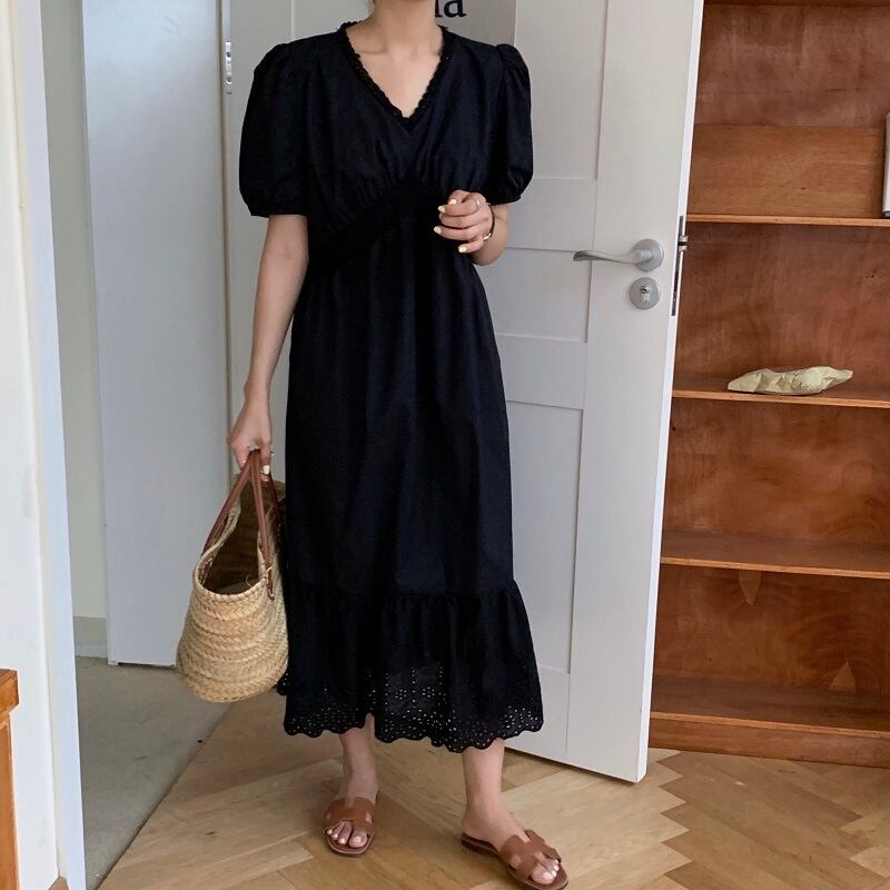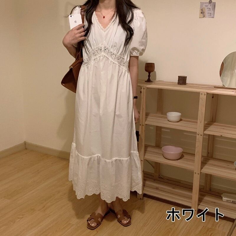 ワンピース レディース 送料無料 2色 フレアワンピース ミモレ丈 ロング丈 レース フリル フェミニン パフスリーブ Vネック おしゃれ スタイル 小顔見せ 着痩せ 体形カバー インスタ トレンド かわいい 女子会 カジュアルドレス キュート ガーリー デート ロマンチック 大人かわいい ホワイト ブラック エレガント サマードレス ハイウエスト お出かけ 旅行 カジュアルドレス レトロ リゾート フレア ボリューム バブルスリーブ こなれ感 ナチュラル レーシー かぎ針編み ティアード