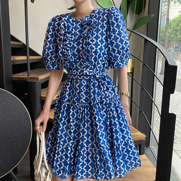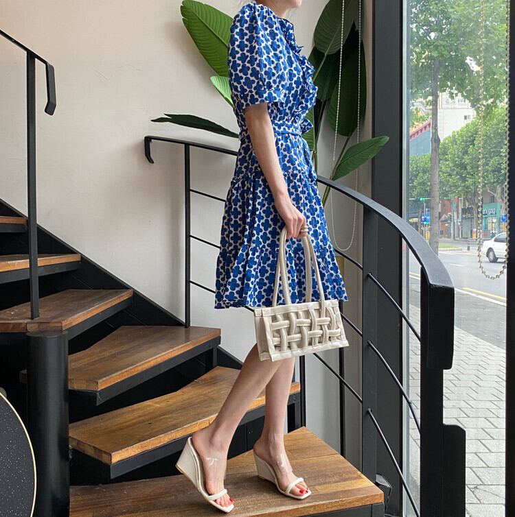 胸元のフリルとウエストリボンがさりげないアクセントに。
