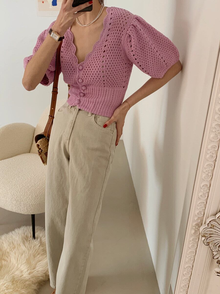 トップス レディース 送料無料 2色 パフスリーブカーディガン ニットカーディガン レース 半袖 おしゃれ スタイル 小顔見せ 着痩せ 体形カバー インスタ トレンド きれいめ かわいい エレガント レトロ キュート ガーリー ボレロ ホワイト ピンク フリーサイズ サマーニット こなれ感 スカラップ 透け感 レーシー ボリューム 女子会 お出かけ デート リゾート ショート丈 ボタン ガーリッシュ ハイウエスト フェミニン レイヤード ロマンチック バルーンスリーブ ニットカーデ パフ袖 夏