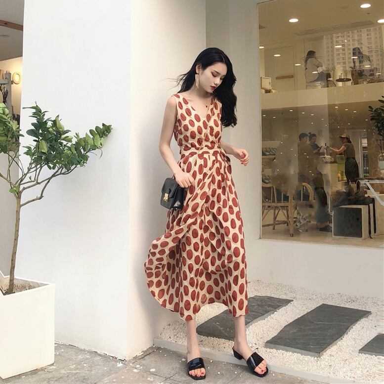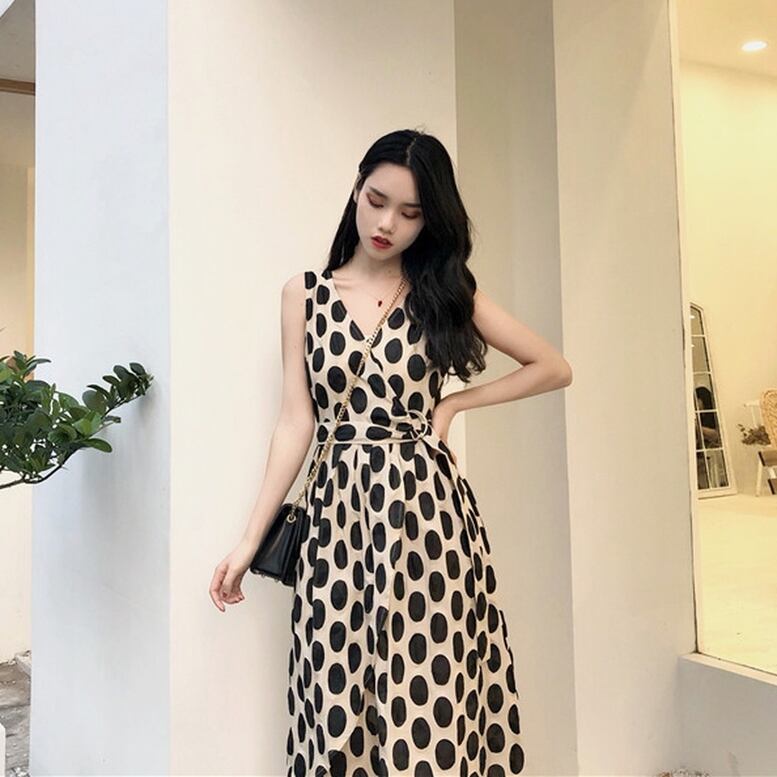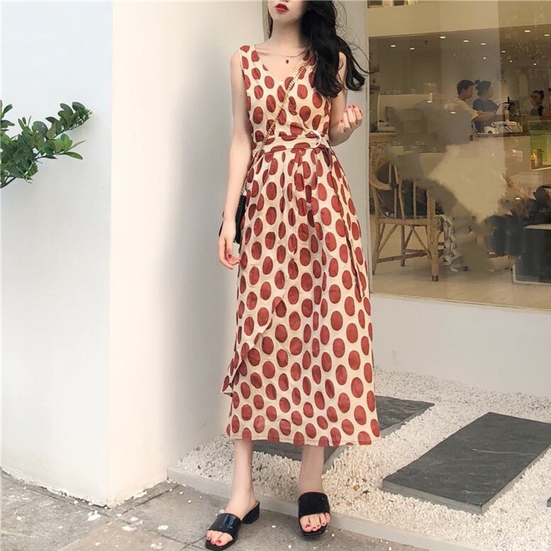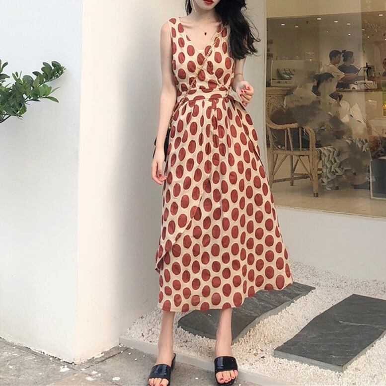 ドット柄ワンピース ノースリーブドレス レディース 送料無料 ワンピース ドレス フレアワンピース ドット柄カシュクールワンピース Vネックドット柄ロングワンピース シャツワンピース フレアワンピース キャミソールワンピース ロングドレス ミモレ丈 ロング マキシ 袖なし ノースリーブ Vネック カシュクール フレア ウエストリボン エレガント 大人可愛い きれいめ ナチュラル 華やか 上品 レトロ キュート ガーリー ドット柄 水玉 脚長 高見え 格上げ インスタ映え 春夏