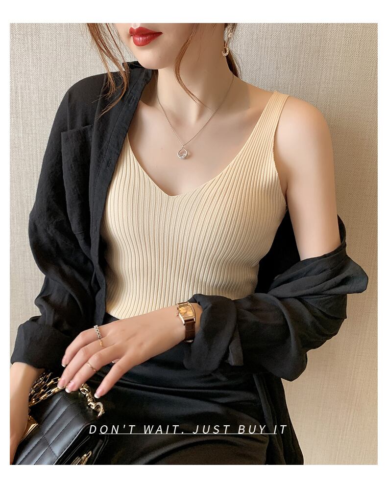 ベーシックなVネックのリブタンクトップ。伸縮性◎