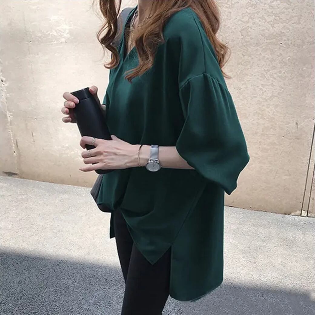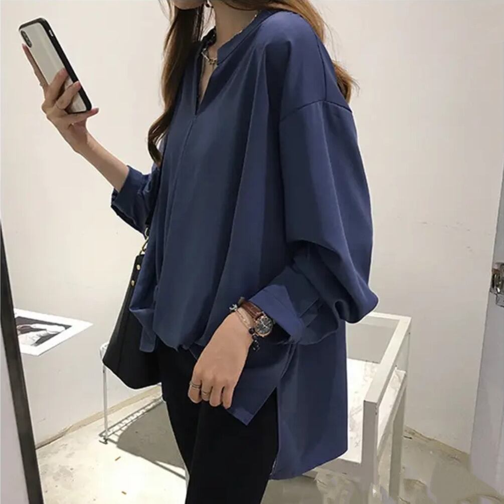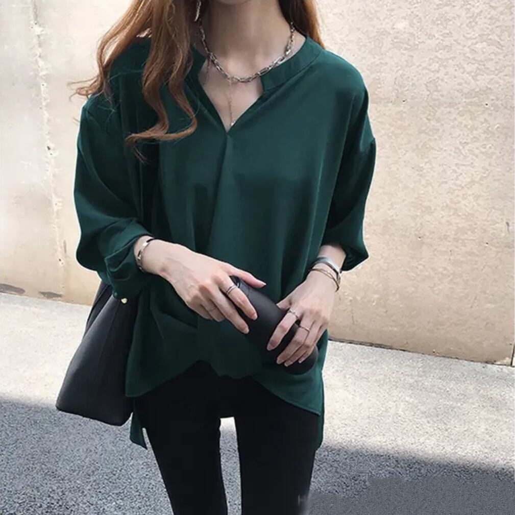 トップス レディース 送料無料 シャツ ブラウス V スタンダードカラー 立ち襟 大きいサイズ ビッグサイズ 大きめ M L XL 2XL 3XL 4XL ビッグシルエット ゆったり ゆる 無地 単色 ホワイト 白 グリーン 緑 ネイビー 紺 ブルー 青 きれいめ エレガント 上品 大人 フェミニン 大人女子 かっこいい フォーマル 長袖 シフォン ポリエステル ワイド プルオーバー シンプル おしゃれ お洒落 こなれ感 抜け感 10代 20代 30代 オフィス ビジネス OL 休日 普段使い 着回し