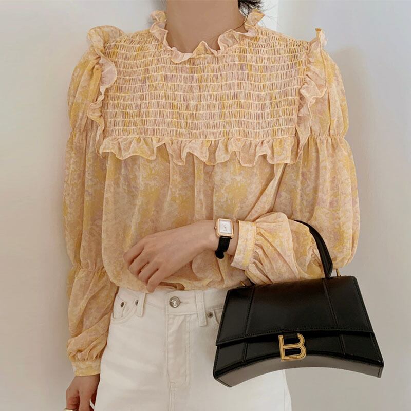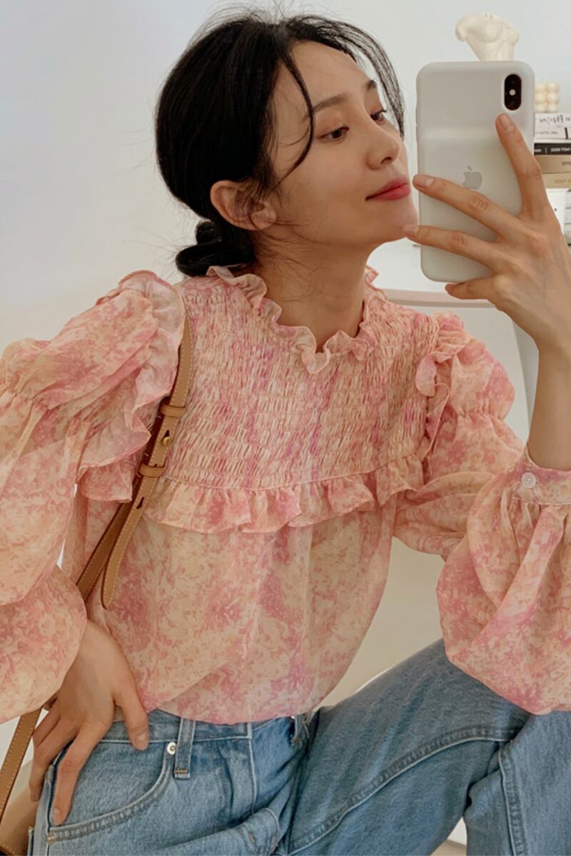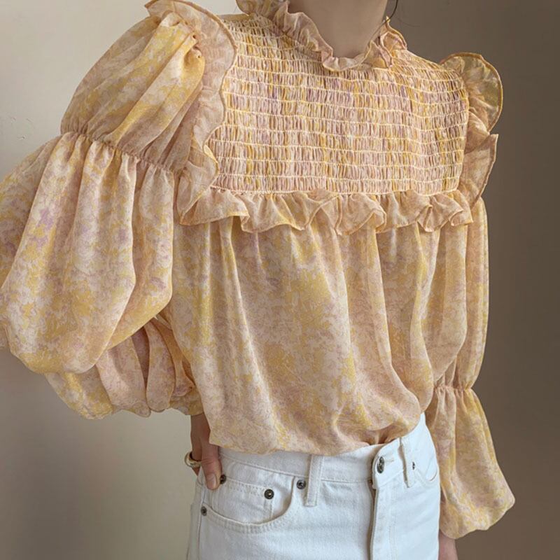 トップス レディース 送料無料 2色 パフスリーブブラウス フラワープリントブラウス 長袖 おしゃれ スタイル 小顔見せ 着痩せ 体形カバー インスタ トレンド フレアスリーブ かわいい エレガント レトロ キュート ガーリー ピンク イエロー フリル スタンドカラー シフォン ルーズ シャーリング ギャザー 女子会 お出かけ デート リゾート ガーリッシュ クラシカル 花柄 フェミニン ロマンチック バルーンスリーブ パフ袖 ボリューム ふんわり ゆったり パステルカラー ダスティカラー