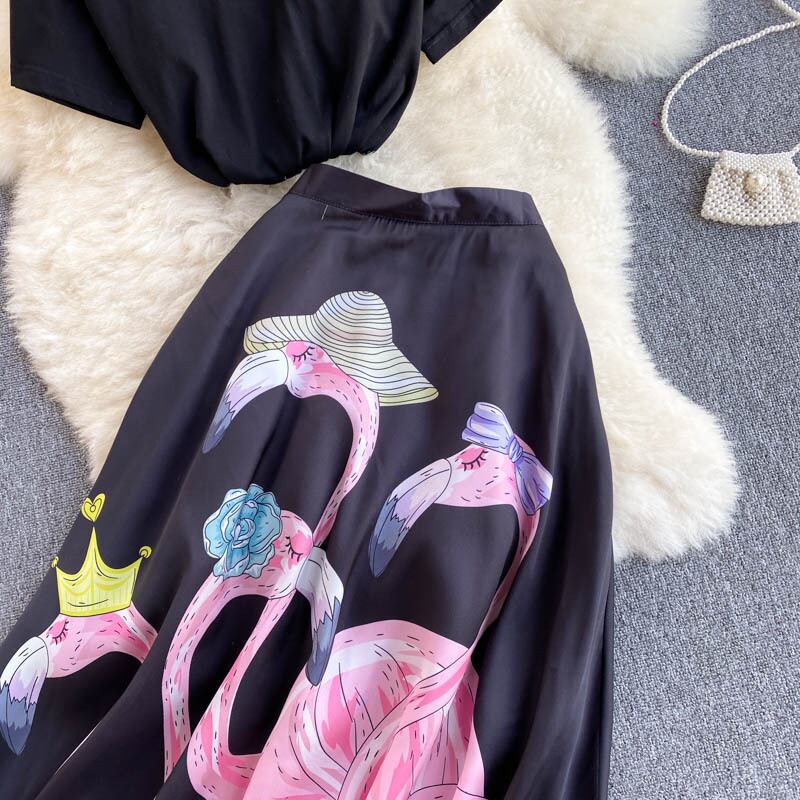 ベーシックなTシャツとフラミンゴ模様のスカートのセット。