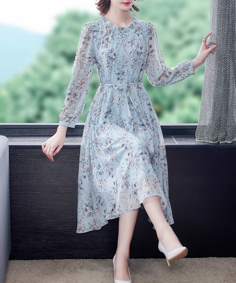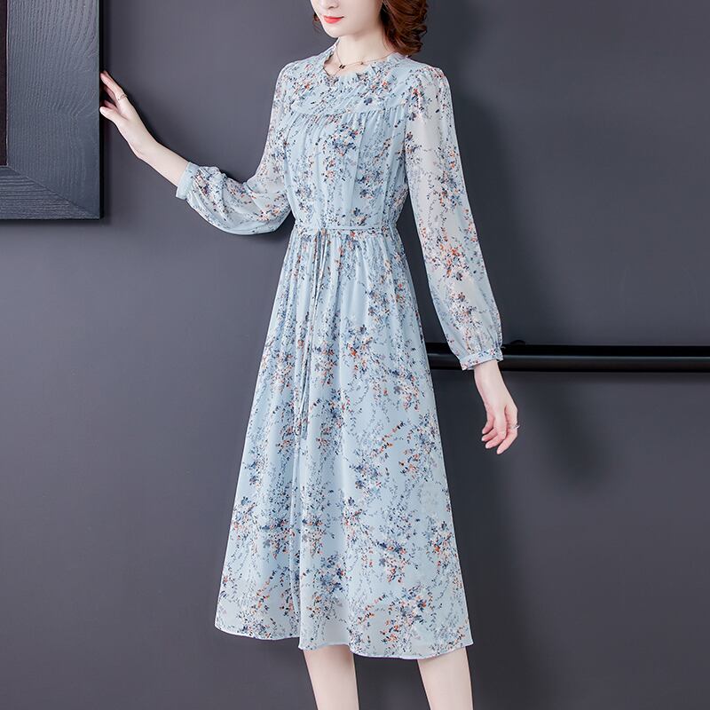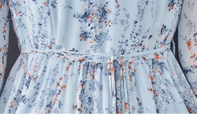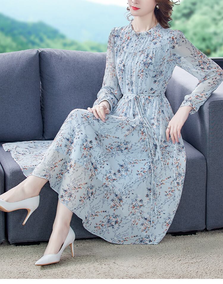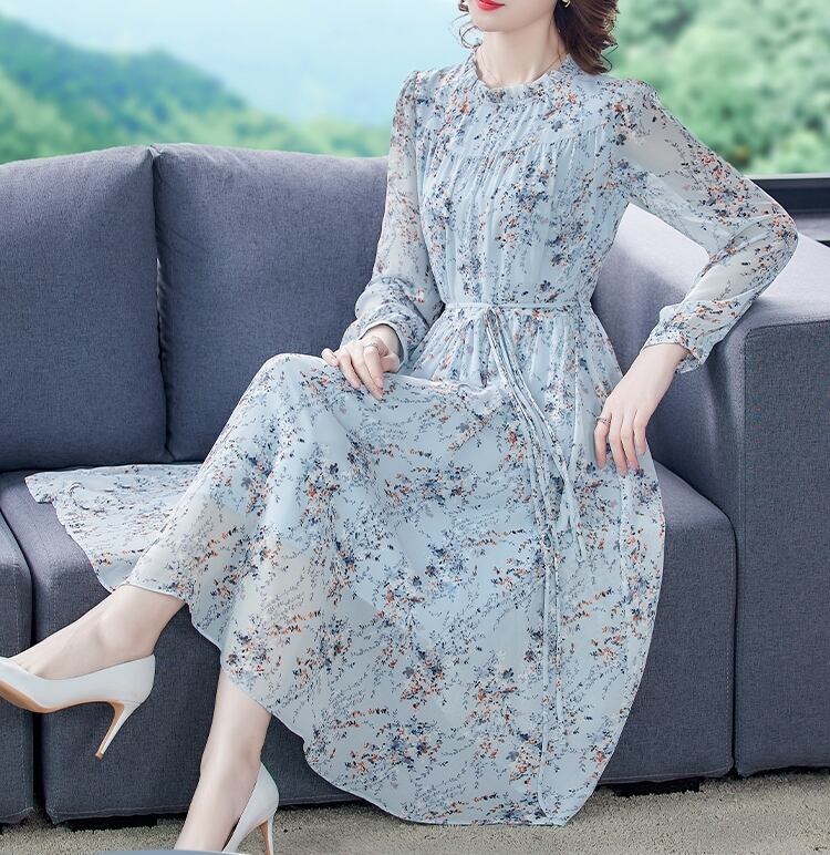 小花柄が可愛いシフォンのミディ丈ワンピース。