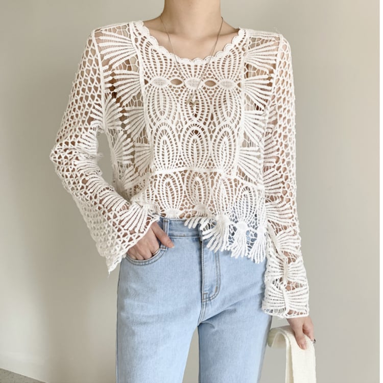 トップス レディース 送料無料 2色 レースニット長袖 透け感 透かし編み おしゃれ スタイル 小顔見せ 着痩せ 体形カバー インスタ トレンド きれいめ かっこいい かわいい エレガント キュート ガーリー ベージュ ホワイト 女子会 お出かけ ボヘミアン 民族調 フェミニン レーシー スカラップ Uネック ラウンドネック デコルテ リゾート レイヤード 透かし編みニット