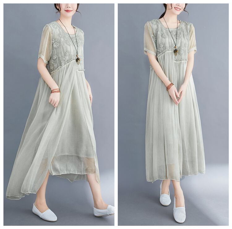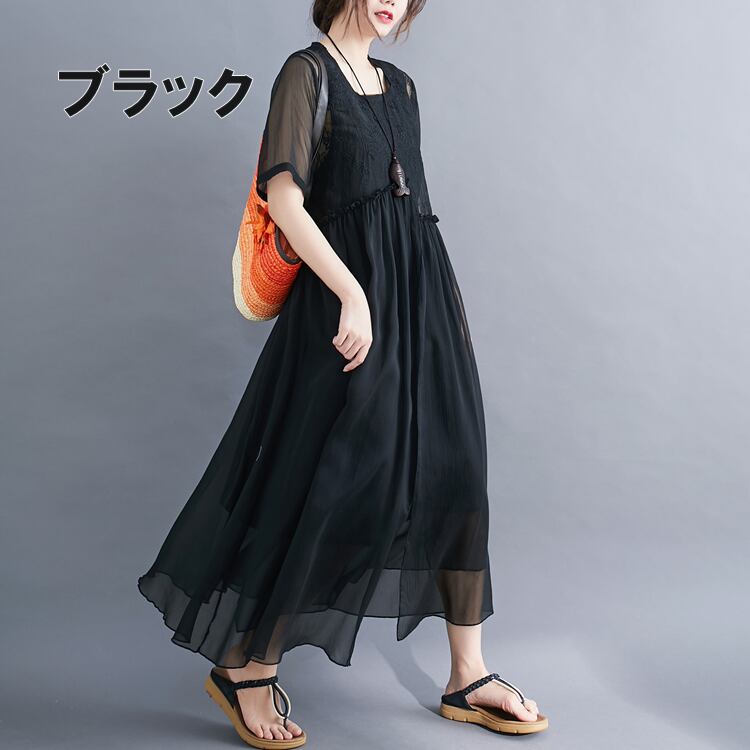 ワンピース レディース 送料無料 5色 ミディアムワンピース シャツワンピース 刺繍 クルーネック レース シフォン フリル スリット フレア 二の腕カバー ゆったり ビッグサイズ 大きいサイズ ゆる マタニティ 楽ちん スリット サイドスリット カジュアル ラフ 体系カバー 着痩せ 無地 レトロ 婦人服 10代 20代 30代 40代 50代 ボックスシルエット Iライン 大人 重ね着 着回し 春服 春 夏服 夏 シンプル お洒落 おしゃれ アジアン エスニック ファッション コーデ スタイル 休日