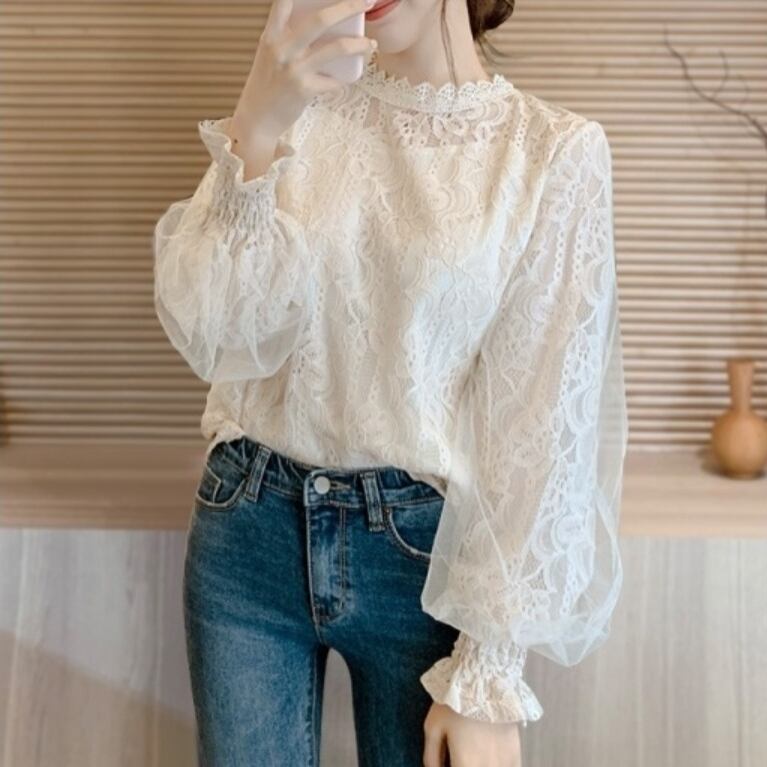 トップス レディース 送料無料 シャツ 長袖 スタンドカラー 立ち襟 丸首 ラウンドネック ランタンスリーブ パフスリーブ バブルスリーブ ラッフルカフス サーキュラーカフス レース 総レース 透け感 抜け感 こなれ感 プルオーバー フリル 可愛い 大人可愛い カジュアル きれいめ ガーリー キュート ラブリー お洒落 おしゃれ 大きいサイズ ビッグサイズ 大きめ ゆったり S M L XL 2XL 3XL ホワイト アイボリー 花柄 フラワー 春 夏 秋 10代 20代 普段使い 着回し ファッション
