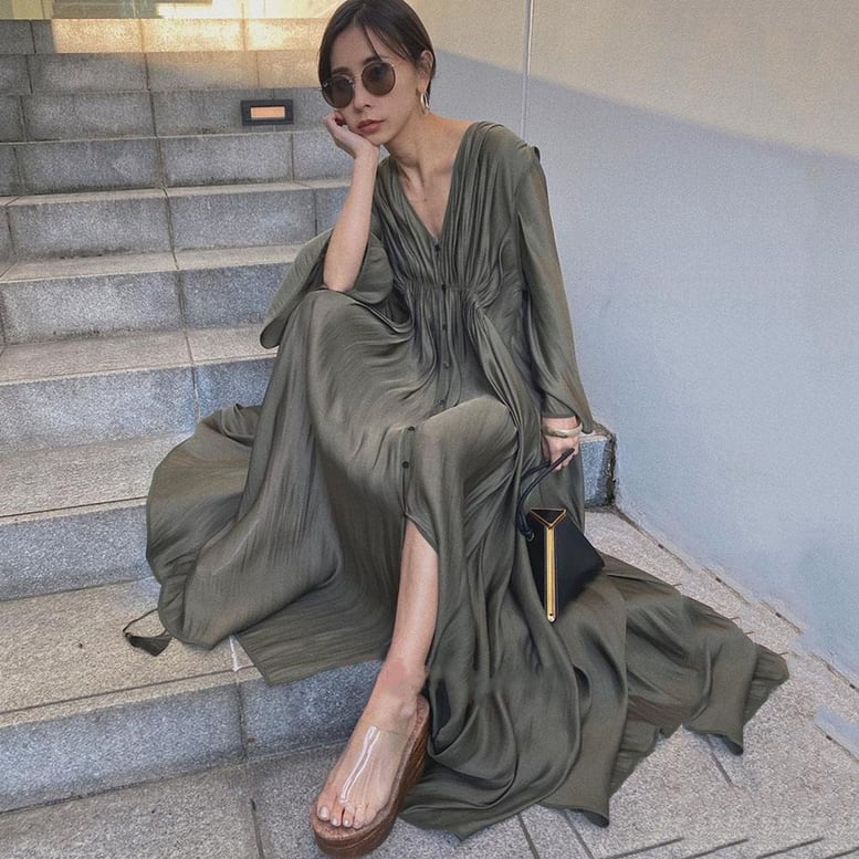 ランタンスリーブロングワンピース ドレス レディース 送料無料 ワンピース シャツワンピース フレアワンピース ロングドレス 前ボタンローブシャツワンピース Vネックギャザードレープワンピース dress ロング マキシ丈 長袖 ドルマンスリーブ フレアスリーブ ドロップショルダー Vネック フレア オーバーサイズ シフォン 透け感 エレガント 大人可愛い きれいめ ナチュラル 上品 くすみカラー 大人カラー ニュアンスカラー 体型カバー 二の腕カバー 脚長 高見え 格上げ インスタ映え 春夏