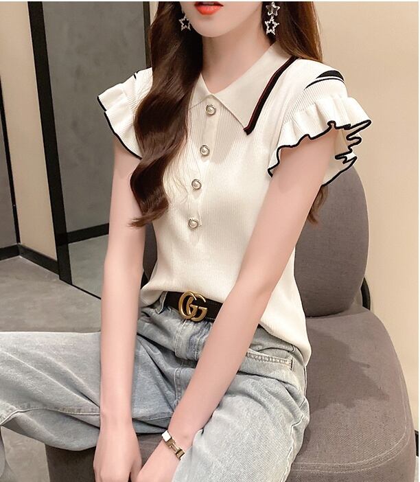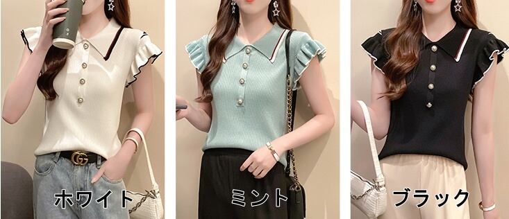 トップス レディース 送料無料 3色 フレアスリーブニット 半袖 フリル袖 パールボタン 襟付き おしゃれ スタイル 小顔見せ 着痩せ 体形カバー インスタ トレンド きれいめ かわいい キュートレトロ クラシカル ホワイト ミント ブラック 女子会 お出かけ オフィス 通勤 OL エレガント フェミニン キュート ガーリー ガーリッシュ プリント パイピング ライン フリル半袖ニット ライン フレンチスリーブ ポロシャツ フリーサイズ
